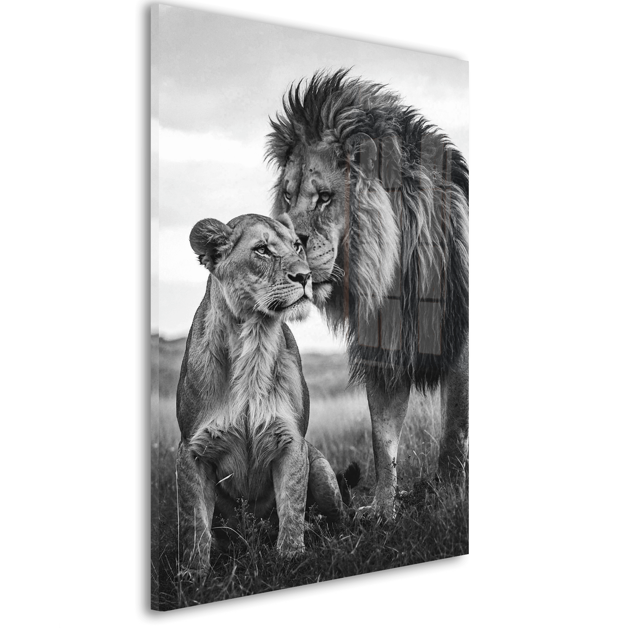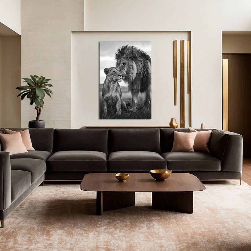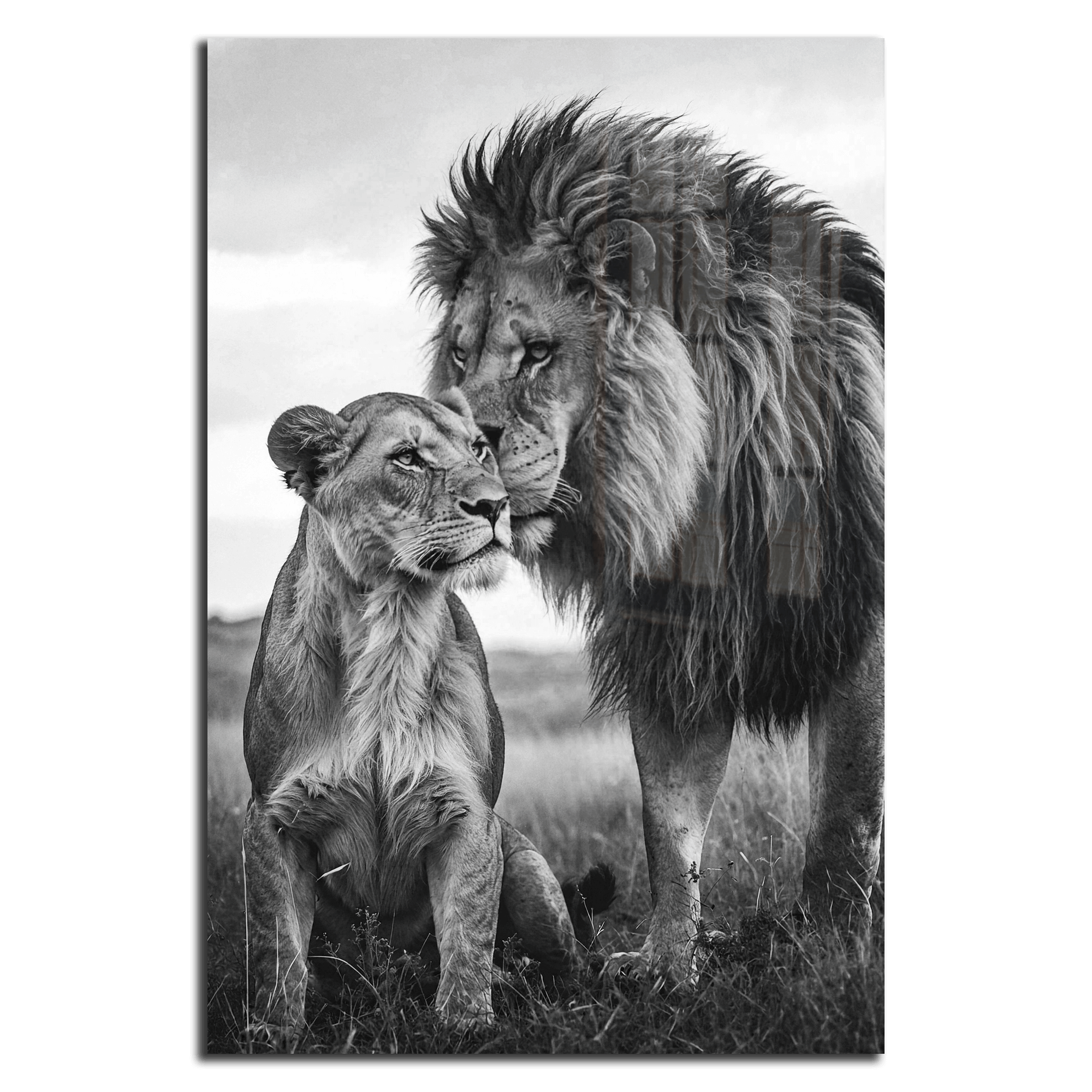 De afbeelding toont een leeuw en een leeuwin in een intieme en rustige houding. De leeuw, met een indrukwekkende en volle manen, staat dicht bij de leeuwin, die kalm zit. Hun gezichten zijn naar elkaar toe gericht, en het lijkt alsof de leeuw zijn kop zachtjes tegen die van de leeuwin aanduwt. Het tafereel straalt een gevoel van genegenheid en verbinding uit. De achtergrond is een open savanne-achtig landschap met grassen, wat de natuurlijke omgeving van deze dieren benadrukt. De foto is in zwart / wit.