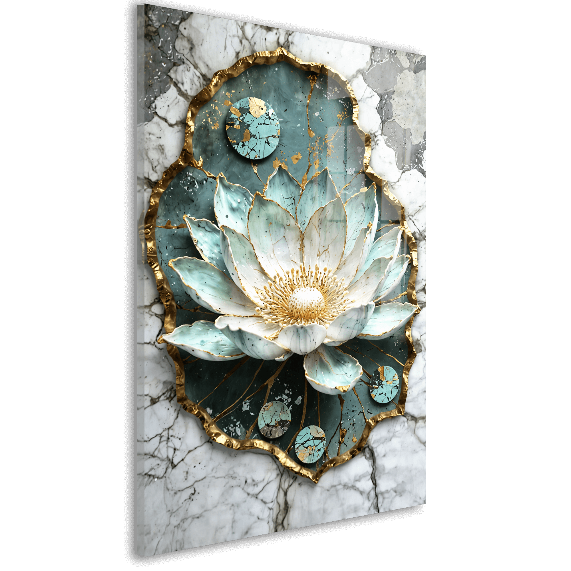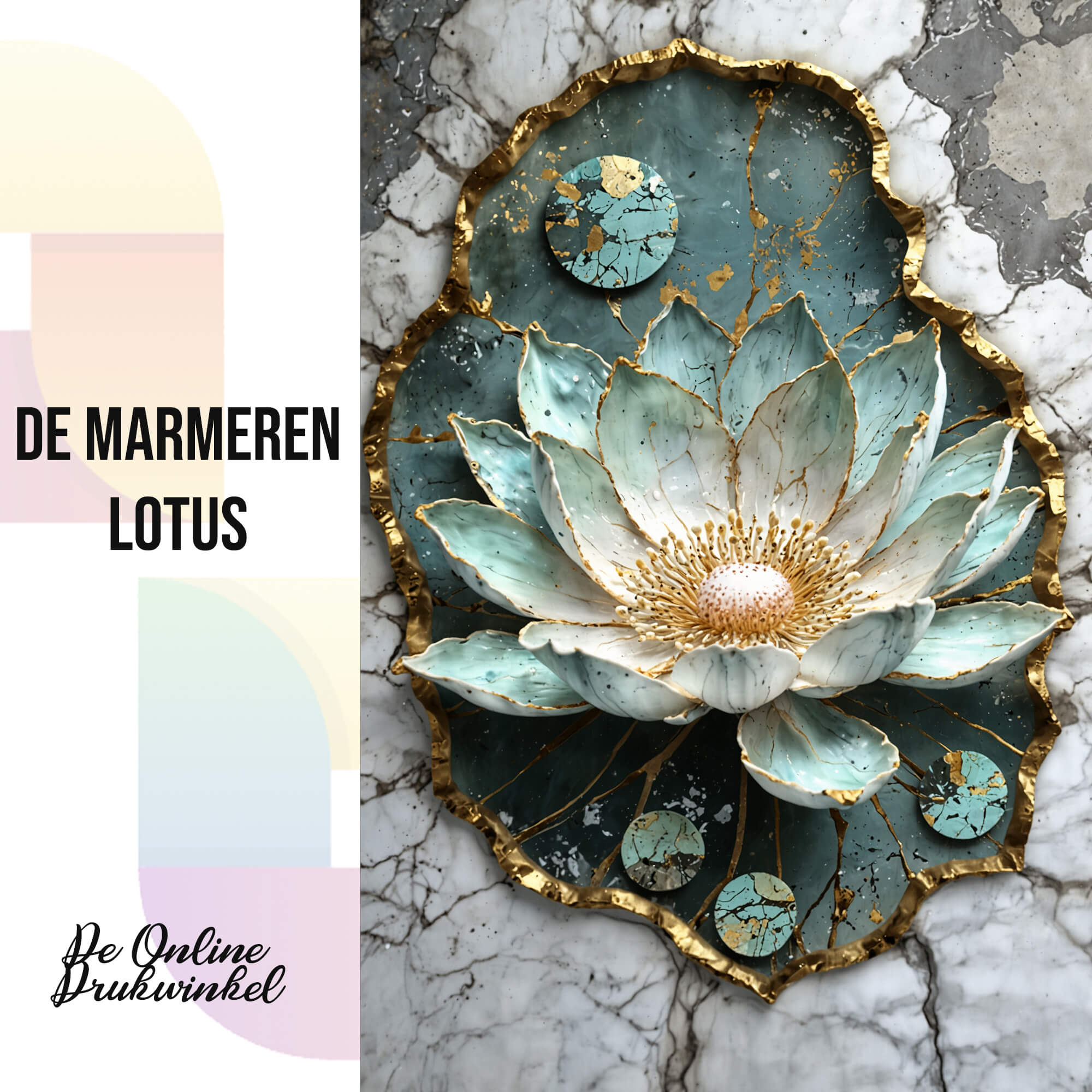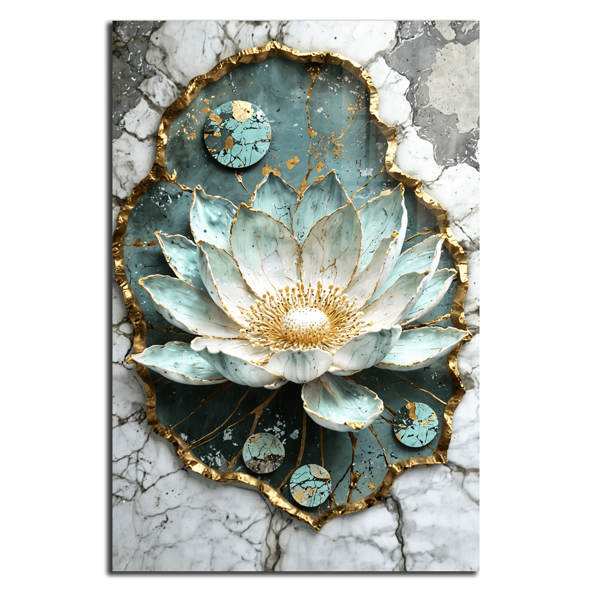 De achtergrond is een abstract patroon dat doet denken aan marmer. De kleuren zijn wit, grijs en goud, wat een mooi contrast vormt met de groene en gouden tinten van de lotusbloem. Er zijn ook enkele cirkels zichtbaar in de achtergrond, die ook met goud zijn afgewerkt. Het geheel maakt een serene en elegante indruk.