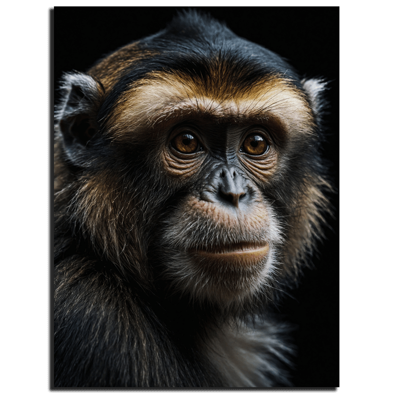 De afbeelding toont een gedetailleerd portret van een aapje, vastgelegd met een gefocuste blik in zijn ogen en een serieuze uitdrukking op zijn gezicht. Met zijn doelgerichte houding en vastberaden trekken, weet het aapje de aandacht te trekken en een gevoel van vastberadenheid over te brengen.