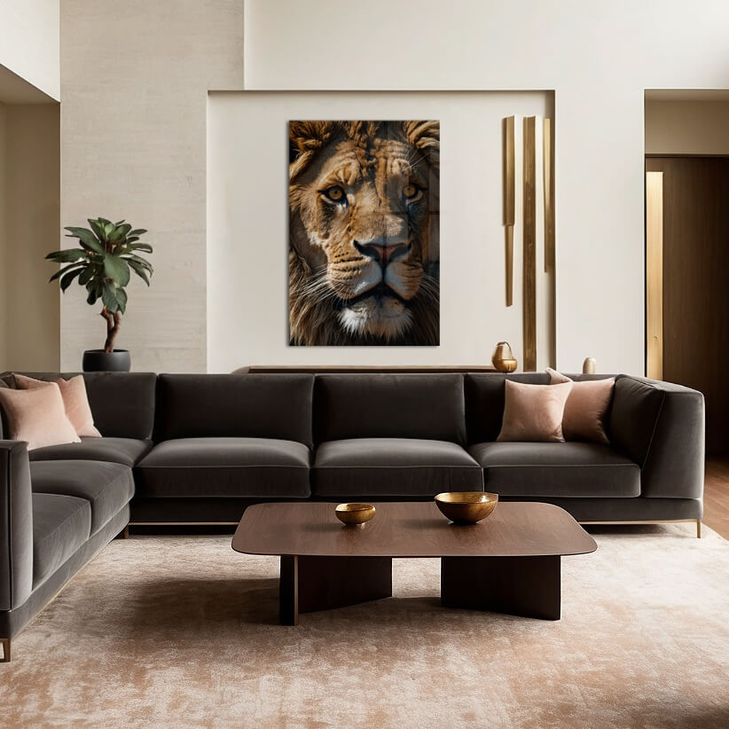De afbeelding toont een gedetailleerd portret van een leeuw, ook wel ‘The King of the Jungle’ genoemd. De leeuw is vastgelegd met een gefocuste blik in zijn ogen en een serieuze uitdrukking op zijn gezicht. Met zijn doelgerichte houding en vastberaden trekken, weet de leeuw aandacht te trekken en een gevoel van vastberadenheid over te brengen.