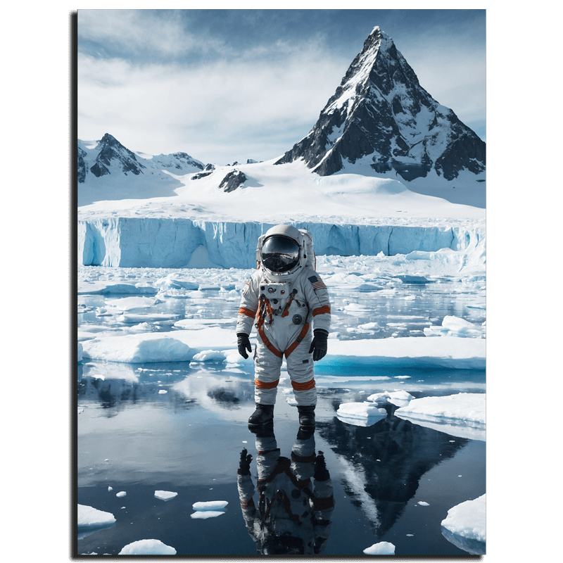 De afbeelding toont een astronaut die is geland op het ijskoude Antarctica, een ontmoeting tussen futuristische technologie en ongerepte ijskoude natuur.